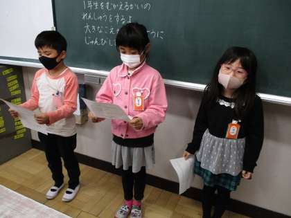 1年生を迎える会に向けて、学級で練習しています。2年生は、1年生で勉強することについて教えます。お兄さんお姉さんになって、1年生を明るく迎えてあげようとはりきっていました。