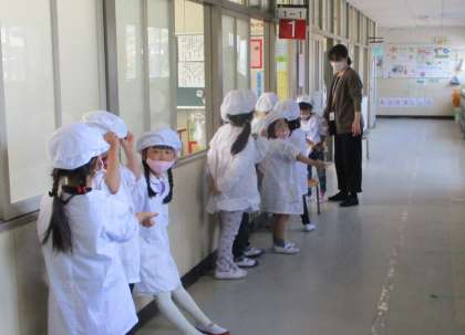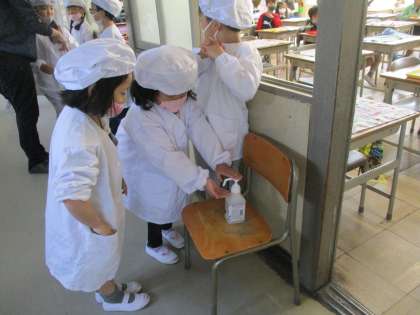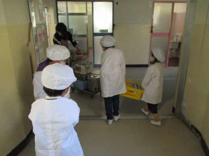 コンテナ室から牛乳やおかずなどを先生と一緒に運びます。