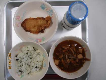 今日の献立は、わかめごはん、牛乳、豚汁、白身魚の黒酢だれでした。