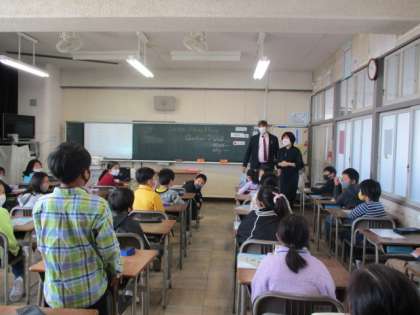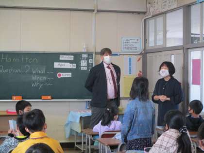 今日は、ALTの先生の初めての授業です。アメリカからみえた先生。最初は緊張していた子どもたちも、質問コーナーをしてもらって笑顔が見られるようになりました。好きな食べ物や、好きな色、アメリカについてなどいろいろ話をしてもらいました。