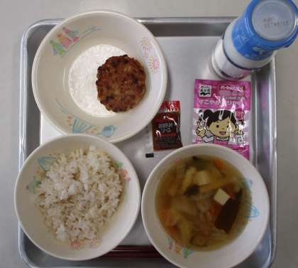 今日の献立は、麦ごはん、牛乳、わかめ汁、キャベツ入りつくね、かつおふりかけでした。