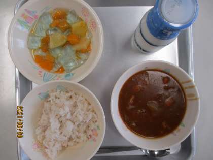 今日の献立は、麦ごはん、牛乳、チキンカレー、さわやかゼリー和えでした。