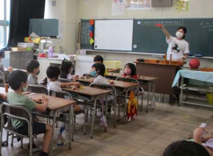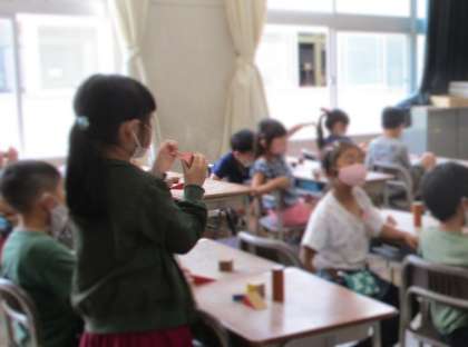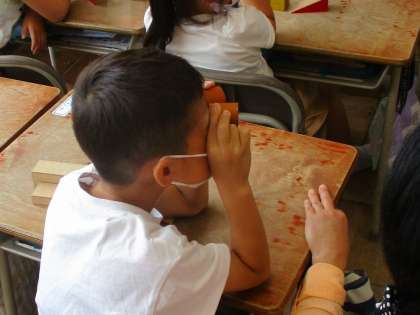 円柱の積み木を使って、望遠鏡の疑似体験をしている子がいました。