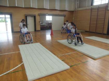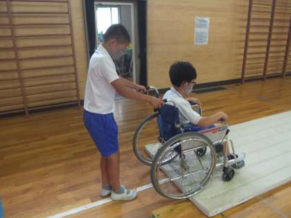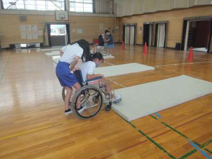 福祉体験の一環で、車いす体験を行いました。なかなか車いすを持ち上げることができない児童が多くいました。車いすの方や、その補助をする方の大変さを身をもって学ぶことができたと思います。これからの生活に生かしてくれると嬉しいです。