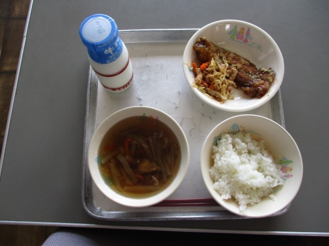 本日の給食はご飯・牛乳・さんまのかば焼き風・もやしのごま酢和え・沢煮わんです。おいしくいただきました。