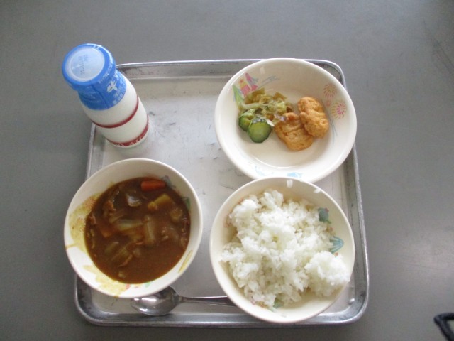 本日の給食は・ご飯・牛乳・ポークカレー・チキンナゲット・福神漬和えです。おいしくいただきました。