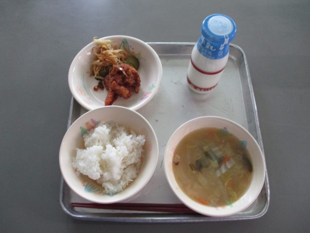 本日の給食はご飯・牛乳・ユーリンチー・もやしの中華和え・中華コーンスープです。おいしくいただきました。