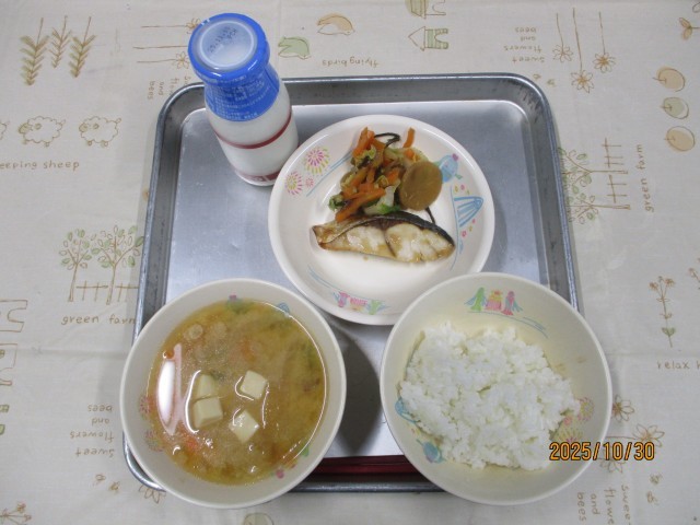 10.30(木) 本日の給食 公開日 2025/10/30 更新日 2025/10/30 給食・食育 本日の給食は、ごはん、牛乳、はまちの照り焼き、つぼ漬和え、さつまいものみそ汁 です。 給食にさつまいもが出ると、秋を感じませんか?