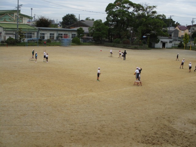 ポートボールの学習です。ボールをパスして回す練習をしていました。