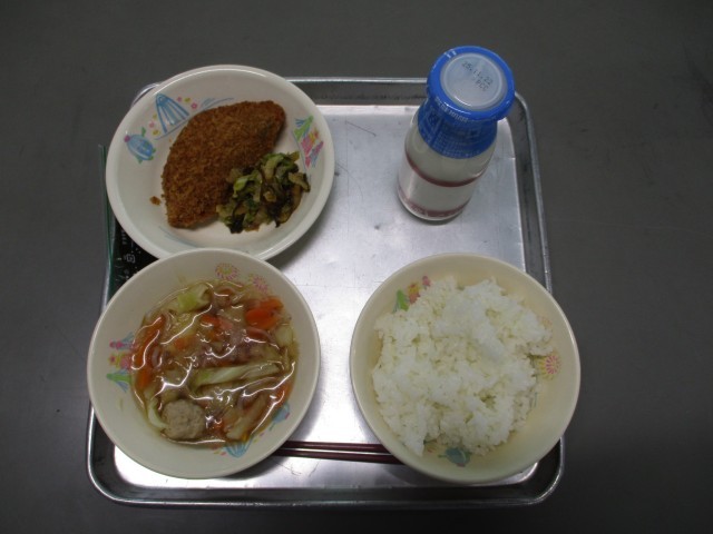 本日の給食はご飯・牛乳・あじフライ・はくさいのこんぶ和え・ちゃんこ汁・味付けのりです。感謝していただきました。
