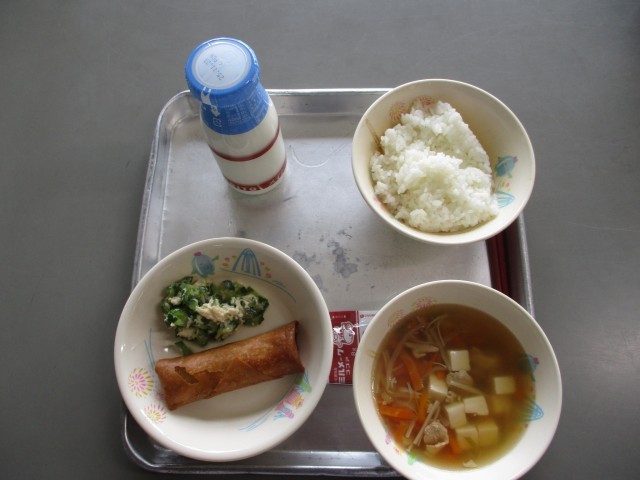 本日の給食はご飯・牛乳・春巻・バンバンジー・豆腐の中華スープ・ココアパウダーです。おいしくいただきました。
