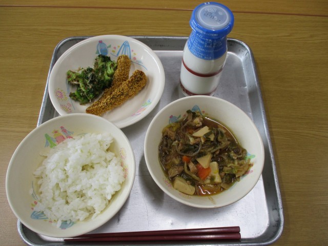 今日の献立は、ご飯、牛乳、ひきずり、いわしフライ、ブロッコリーのおかか和えでした。