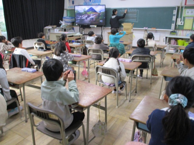 花だんにチューリップの球根を植えます。どうやって植えるのか、先生のお話を聞いています。