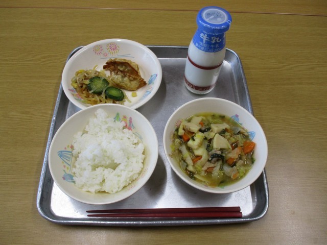 今日の献立は、ご飯、牛乳、八宝菜、揚げギョーザ、バンサンスーでした。