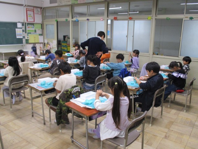 「いっしょにおさんぽ」の学習です。粘土をひねったり転がしたり、へらを使ったりして作品を作りました。