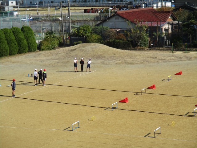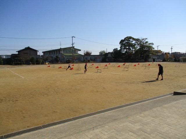 運動場をいっぱいに使って、ハードル走に取り組みました。