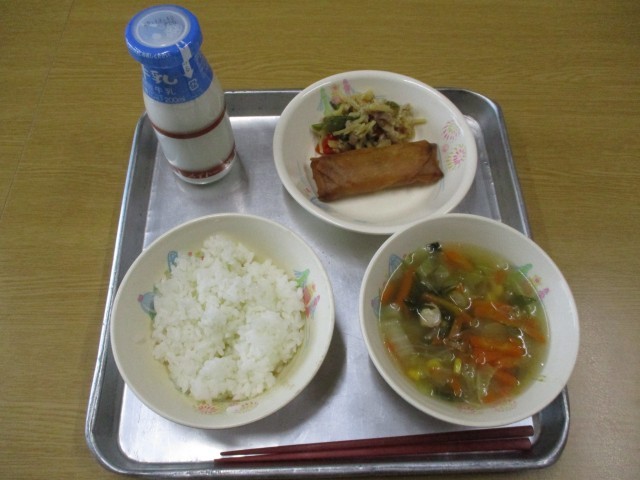 今日の献立は、ご飯、牛乳、チンジャオロース、春巻、はるさめスープでした。