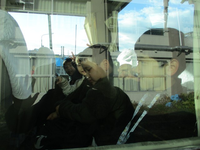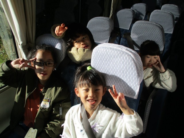 今日は、水泳の授業です。バスに乗って「行ってきまーす!」