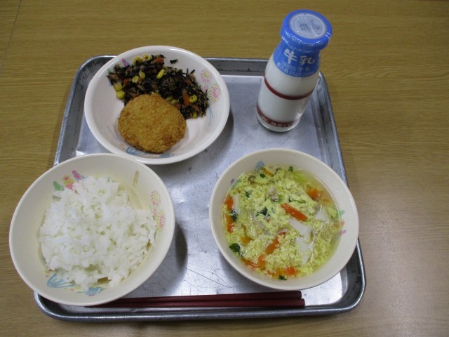 今日の献立は、ご飯、牛乳、ミンチカツ、ひじきのいため煮、茶わん蒸しスープでした。