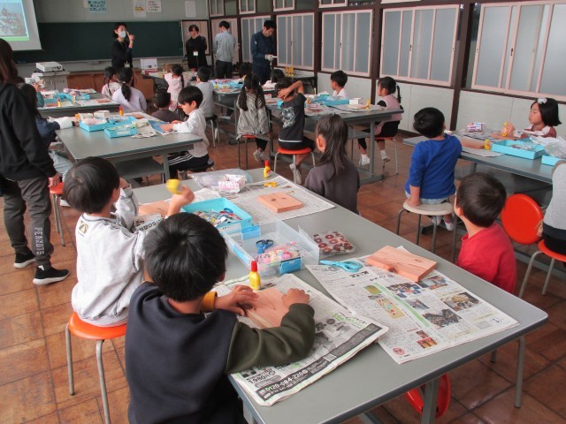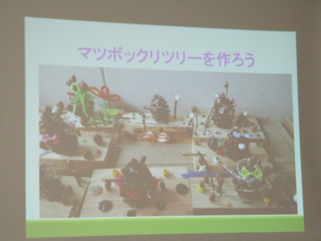 今日は「木づくり教室」がありました。自然の素材でクリスマスツリーを作りました。