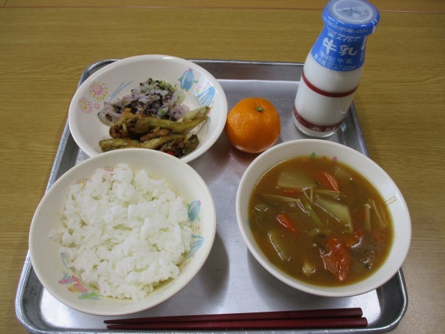 12・11(木)本日の給食 公開日 2025/12/11 更新日 2025/12/11 給食・食育 今日の献立は、ご飯、牛乳、わかさぎとれんこんの南蛮漬け、赤じそ和え、かぶのみそ汁、みかんでした。明日は、冬野菜のシチューです(*^-^*)