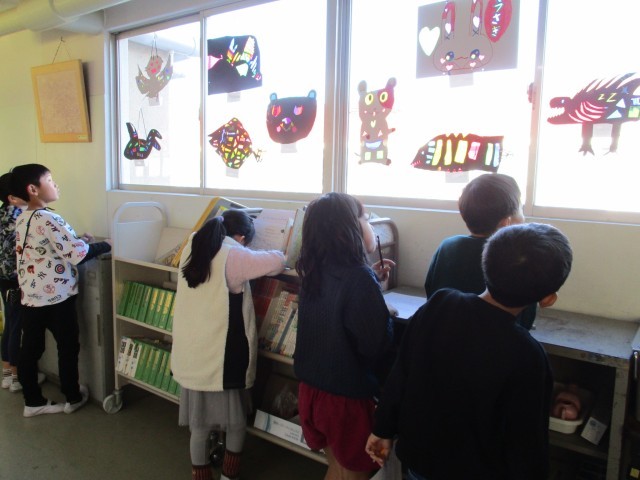 作品の鑑賞をしました。光が差し込んで、作品が輝いていました。