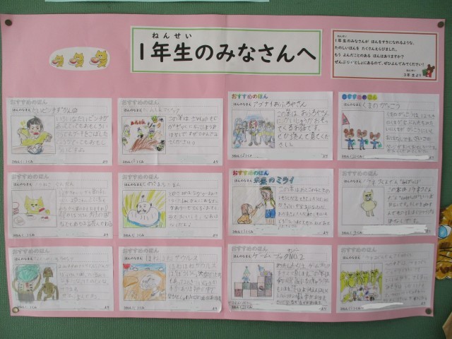 3年生が、1年生におすすめの本を紹介してくれていました。すてきな掲示ですね。みんな、ありがとう!