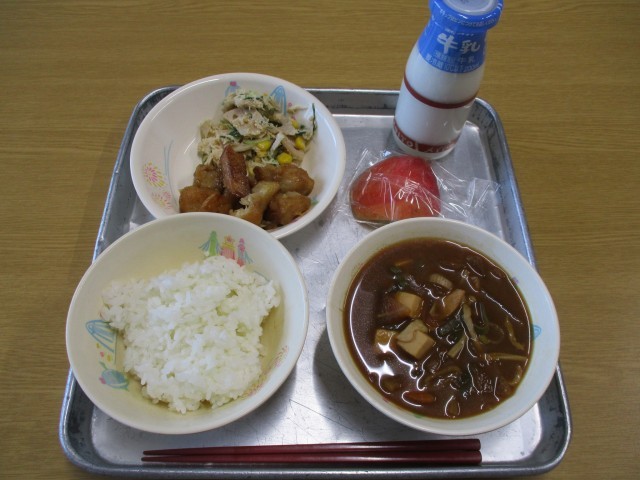 今日の献立は、ご飯、牛乳、たらとじゃがいものゆずだれがらめ、シャキシャキ和え、冬至のみそ汁、りんごでした。