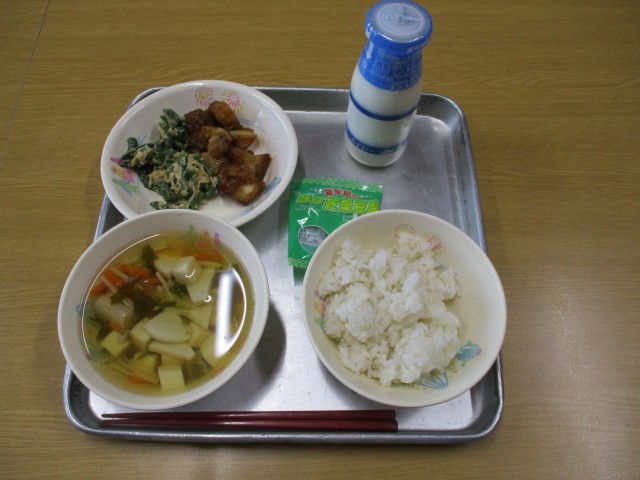 1・19(月)本日の給食 公開日 2026/01/19 更新日 2026/01/19 給食・食育 今日の献立は、麦ご飯、牛乳、あんこうとじゃがいもの甘がらめ、いんげんのごまささみ和え、すまし汁、味付乾燥豆腐でした。明日は、ポークカレーです(≧▽≦)
