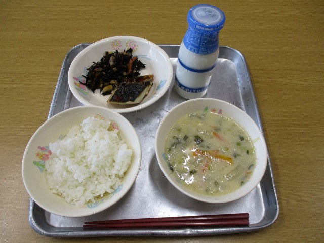 1・21(水)本日の給食 公開日 2026/01/21 更新日 2026/01/21 給食・食育 今日の献立は、ご飯、牛乳、さわらの梅だれがけ、大豆の磯煮、豆乳ごまみそ汁でした。明日は、ソースカツが出ます(≧▽≦)