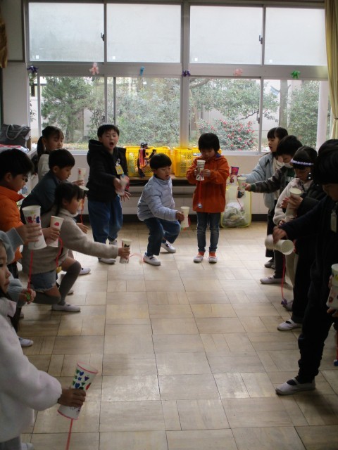 紙コップで作ったけん玉を、みんなで試しました。