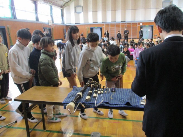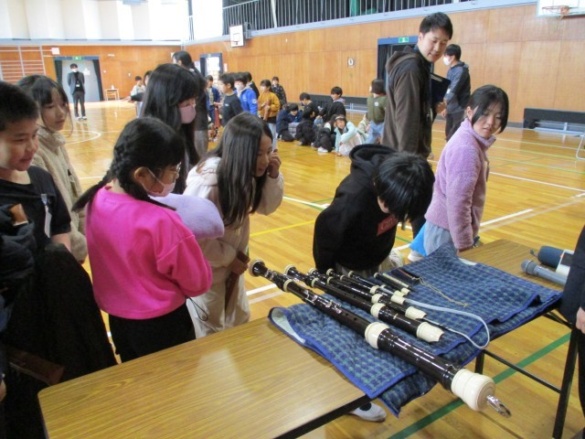 授業後に、リコーダーを近くで見せてもらいました。大きなものから小さなものまでありましたが、これより大きなリコーダーもあるそうです。