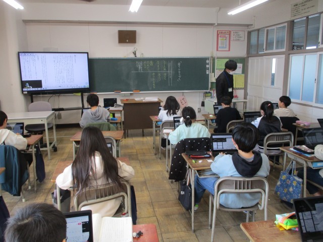 タブレットを使って、たくさんの友達の意見を確認しています。