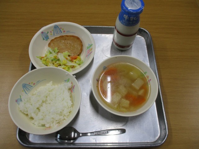 今日の献立は、ご飯、牛乳、ボロニアステーキ、春キャベツのサラダ、かぶのコンソメスープでした。