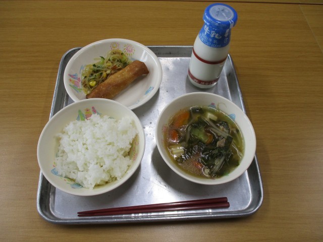 4・13(月)本日の給食 公開日 2026/04/13 更新日 2026/04/13 給食・食育 今日の献立は、ご飯、牛乳、春巻、 バンサンスー、チンゲンサイと豆腐の中華スープでした。明日は、みかんゼリー和えが出ますよ(≧▽≦)