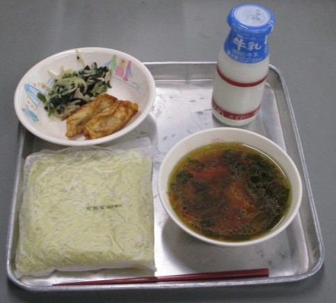 本日の給食は中華めん、牛乳、しょうゆラーメン、揚げギョーザ、切干しだいこんの中華和えです。おいしくいただきました。