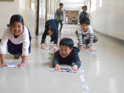 廊下の水拭きを笑顔でできる3年生。 掃除も楽しくなるね!