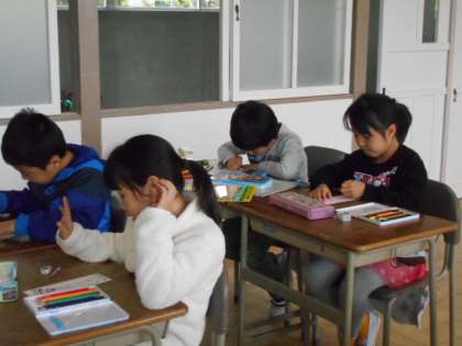 手描きの名札に色を塗る。