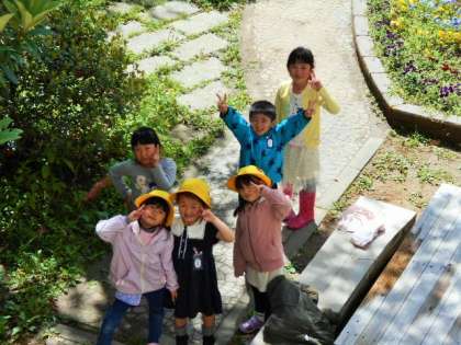 中庭で手を振りポーズをとる1年生。
