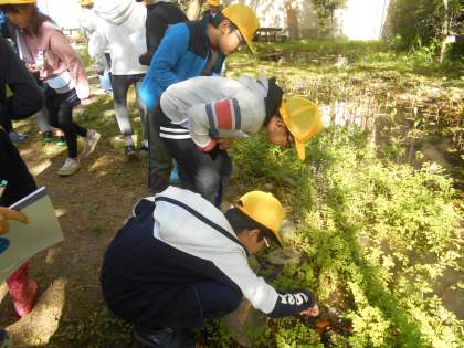 理科の授業では「季節の生き物」を学習しています。今日は、中庭のトンボ園にて観察をしました。
