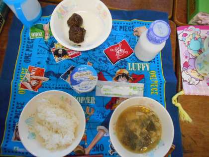 【献立】 ごはん 牛乳 わかめスープ にくだんご2こ フローズンヨーグルト