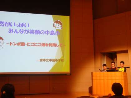 中島小学校は、持続可能な社会づくりの担い手を育む教育とされるESDの推進拠点となっており、環境学習に取り組んでいます。3名の子どもたちは、にこにこ畑やトンボ園を活用した環境学習について、わかりやすく発表することができました。さらに、他校の活動の様子を聞いて、意見交流をすることができました。