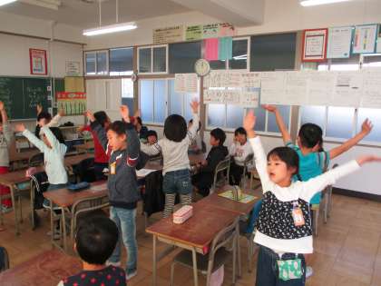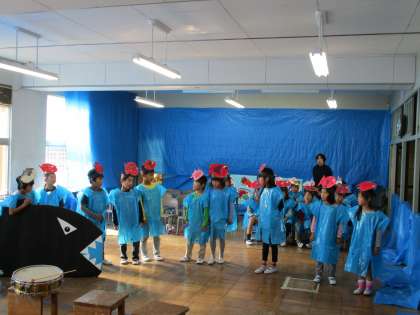 歌を聞き合う、動きをつけてせりふを聞き合う。