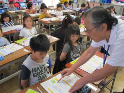 ていねいに れんしゅうしたもじを せんせいにみてもらいます。