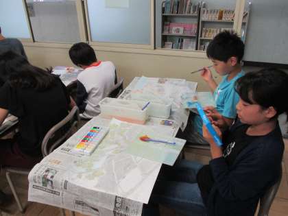 水彩絵の具の特性を生かして色をつけます。