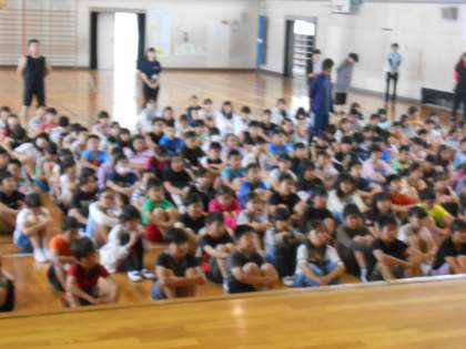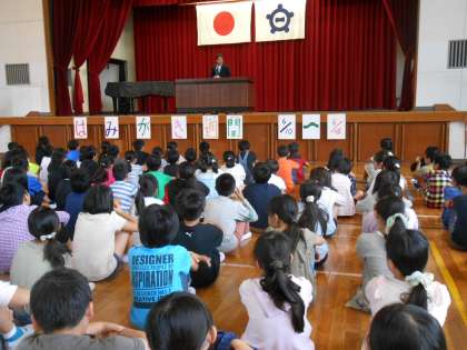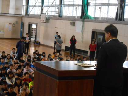 朝礼で、交通安全や正しい廊下歩行についての話をしました。