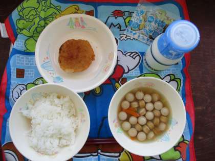 【献立】 ごはん 牛乳 ベジタブルスープ れんこんサンドフライ ごもくつくだに