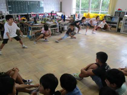 9・18(水) 4年1組 仕上げです 公開日 2019/09/18 更新日 2019/09/18 4年生 運動会で表現する「ソーラン節」の練習。 友だちの前で踊ることで、よい点や直した方がよい点を話します。 運動会当日、満足のいく踊りができるといいね。