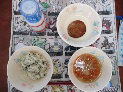 【献立】 わかめごはん 牛乳 とりだんご汁 とびうおバーグフライ