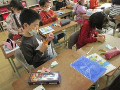 色のついた紙を折り目をつけてから